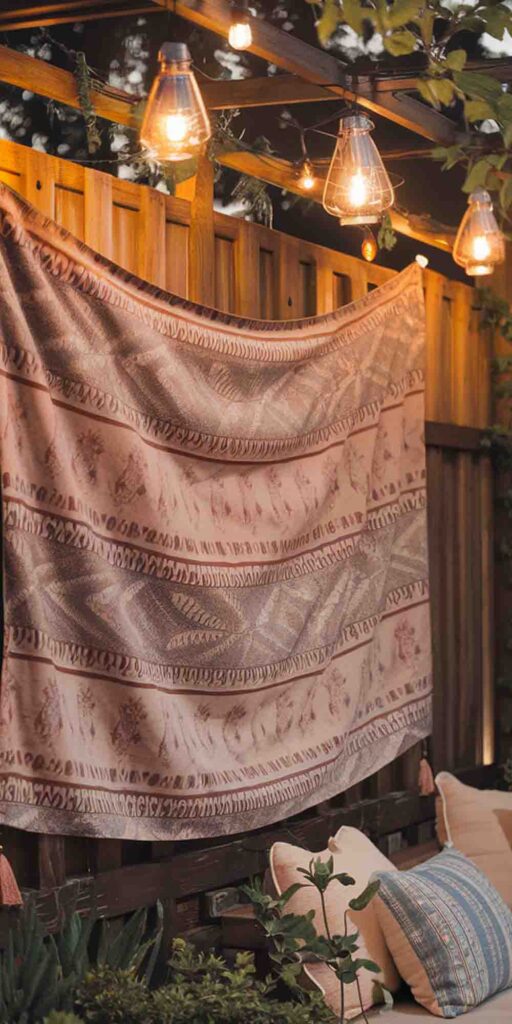 Transform your wooden fence into a bohemian masterpiece by attaching a weatherproof fabric tapestry.