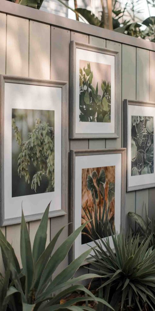 Hang weatherproof frames filled with botanical prints, vintage signs, or personal artwork to create an outdoor gallery wall.