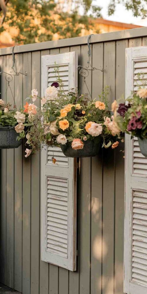 Add vintage charm to your fence with old window shutters—think weathered wood for that cottagecore feel.