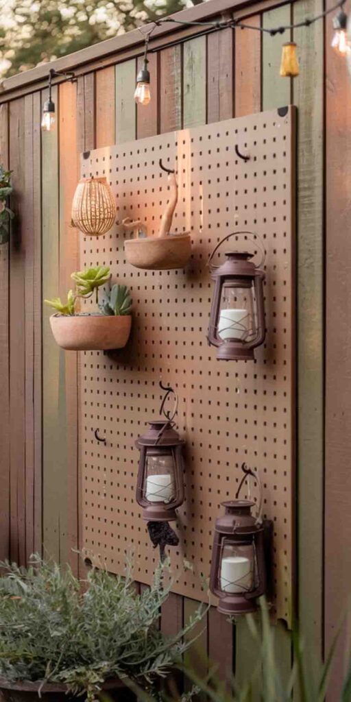 Attach a large outdoor pegboard to your wooden fence for a versatile decor solution.