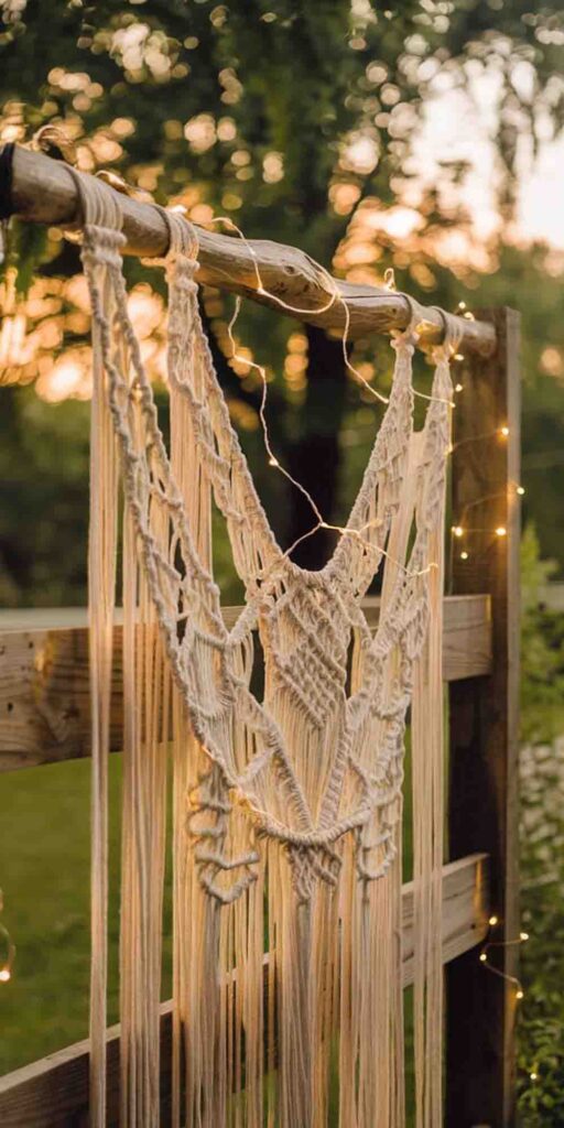 The textured macramé paired with soft lighting creates an inviting atmosphere—perfect for cozy evenings or outdoor celebrations.