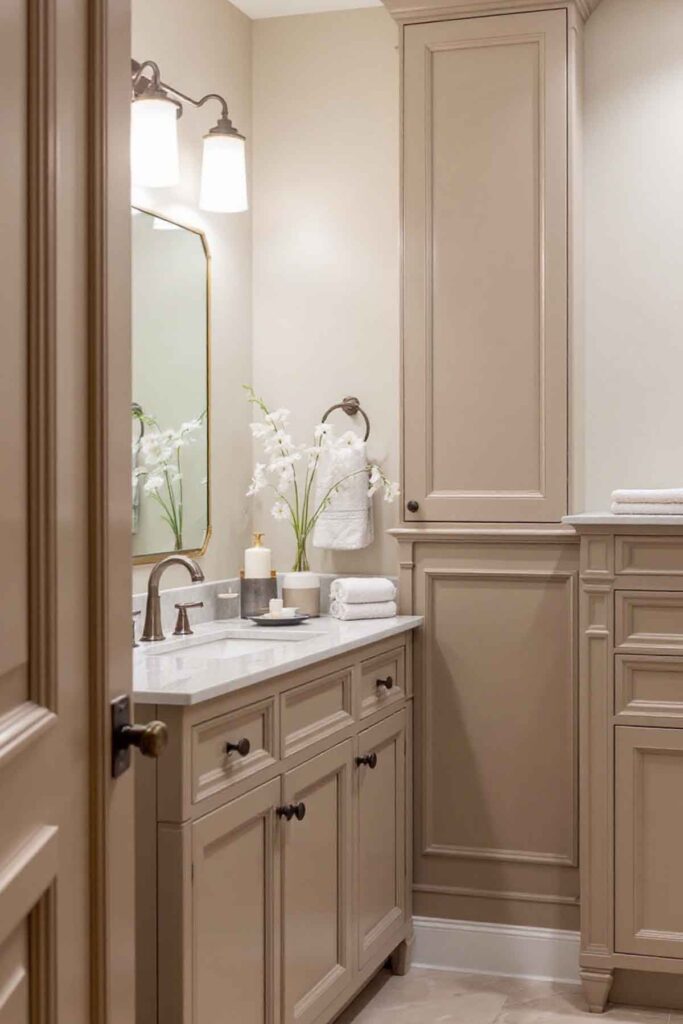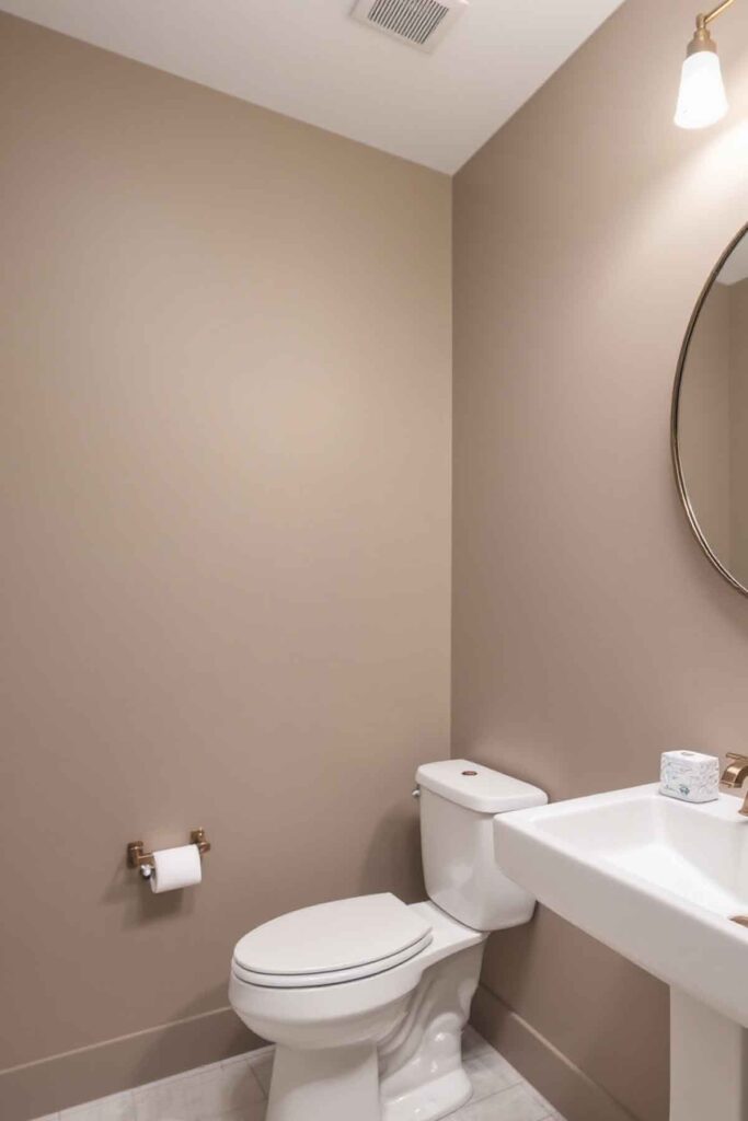 Deep taupe is a versatile color that adds an elegant touch when paired with lighter neutrals. Consider using it on vanity cabinets or trim to create a layered, high-end look.