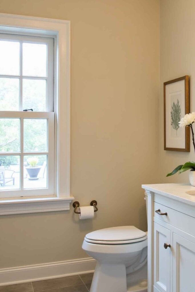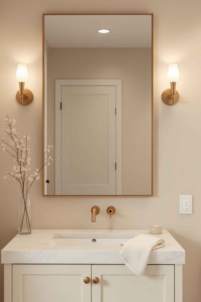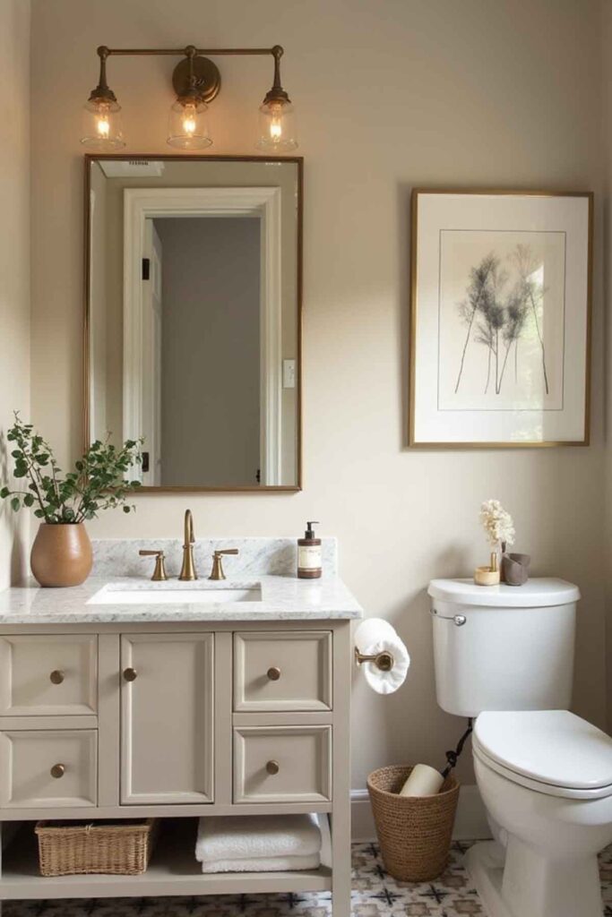 A soft beige foundation creates a warm and welcoming powder room.