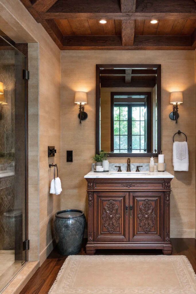 The combination of earthy tones and luxurious accents like brass or polished nickel balances rustic warmth with refined elegance.