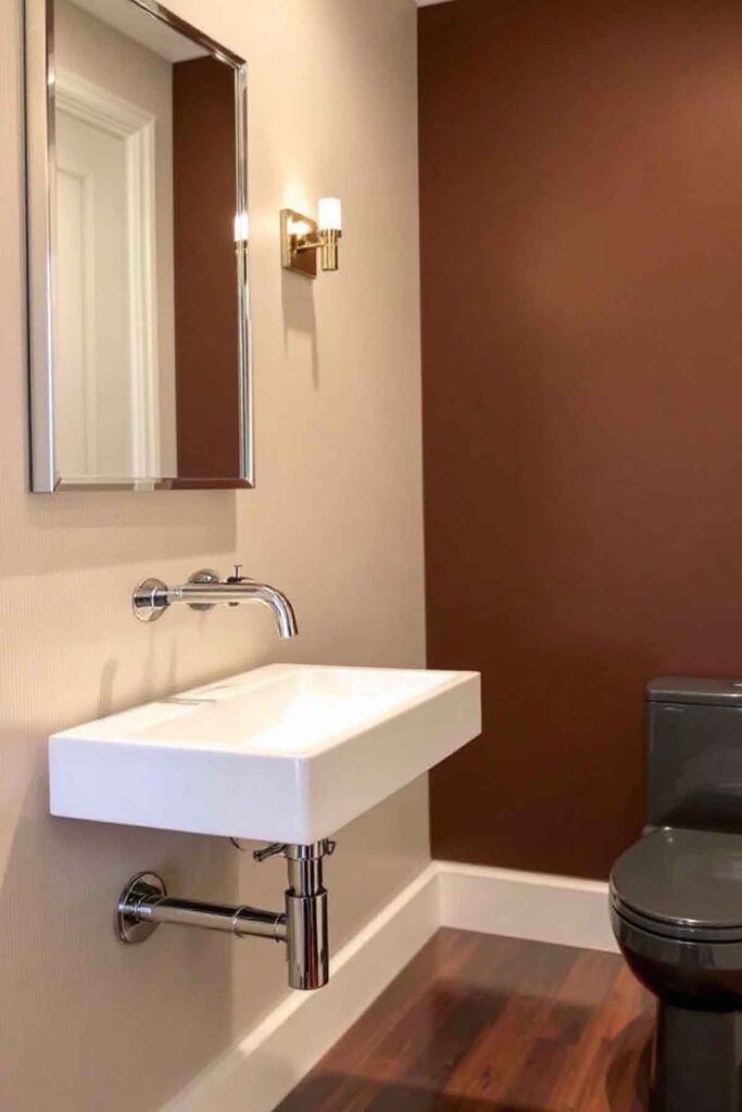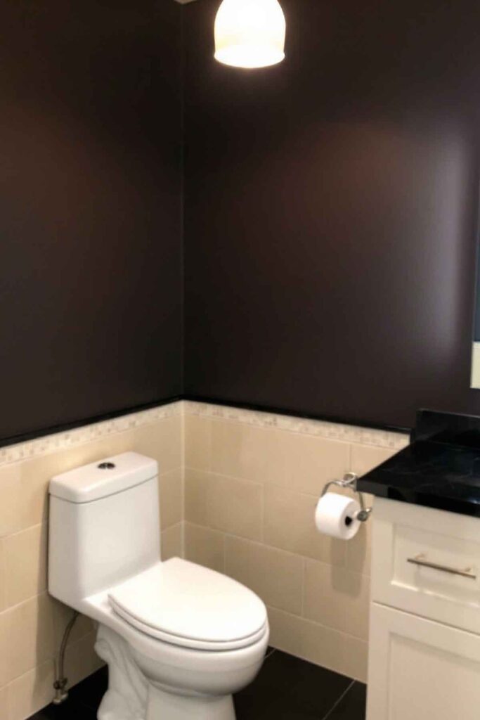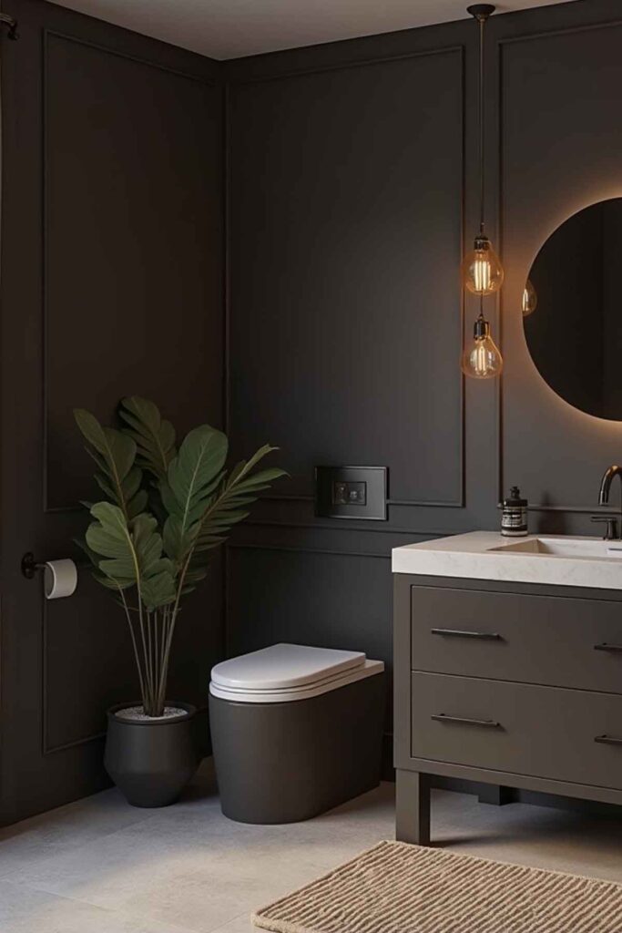 For a striking, high-contrast look, use dark mocha or charcoal brown as a backdrop against crisp white fixtures.