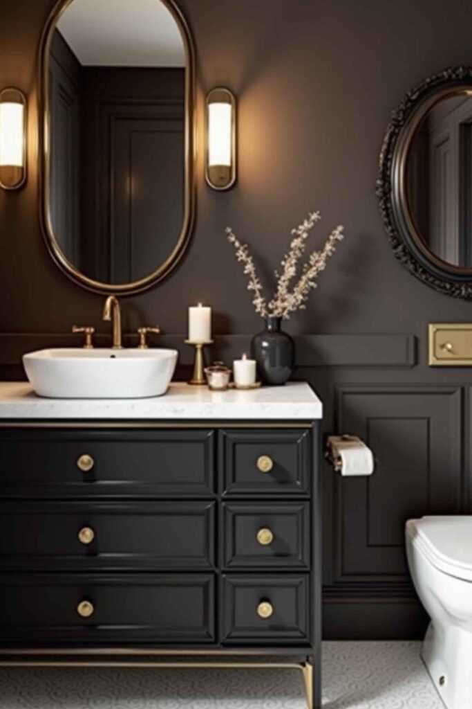 A bold charcoal brown sets the stage for an intimate and striking powder room.
